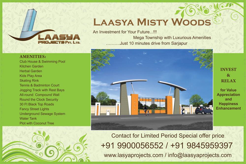 LAASYA Projects is amongst the renowned Real Estate Companies developing townships with innovative ideas and high-tech amenities. The company not only aims to provide flats or houses, but wishess to provide maximum satisfaction and happiness along with a comfortable living style. Misty Woods is the ultimate and an unique venture by LAASYA Projects that provides class, comfort, ease, natural surroundings, healthy environment and open spaces. This mega township with luxurious amenities is one hour away from Bangalore City and 20 minutes drive away from Sarjapur. The natural surroundings provides fresh air and cool breeze in a peaceful environment away from city.